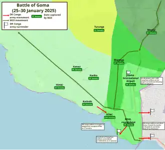 Early in the morning of January 25, M23 advanced on the outskirts of Goma[53] alongside heavy bombardments, but advances were reportedly pushed back by DRC forces.[28] On the outskirts of the city, hundreds of thousands of civilians were displaced, especially due to the bombardments.[52] M23 closed the airspace around Goma International Airport.[53] Order in the city itself had reportedly not broken down, with a heavy police presence since the beginning of the offensive.[28] The Congolese armed forces (FARDC) set up a defensive line in the northern part of the city and the Birere area, including tanks, and are assisted by Romanian mercenaries and the "Wazalendo" local pro-government militia.[15] A Romanian private military company had been hired by the government to provide training for the Congolese army, and was also used to guard important locations outside Goma.[22] The FARDC fought off the initial M23 attack on January 25.[60] One Uruguayan peacekeeper was killed.[57]
