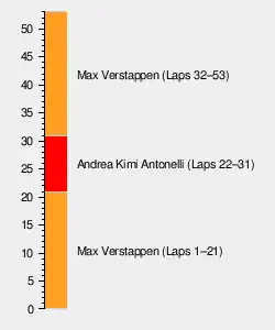 Max Verstappen of Red Bull Racing from pole position went on to win the race, with the two McLarens of Lando Norris and Oscar Piastri completing the podium. Kimi Antonelli of Mercedes became both the youngest driver to lead a race and to set a fastest lap in Formula One history.[17][18]