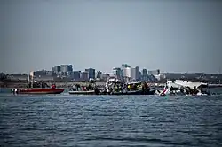 The fuselage of Flight 5342 was found upside down in three sections in the river and was recovered.[3] The search for debris was extended to the Woodrow Wilson Bridge, three miles (5 km) south of the airport.[2] A crane used to lift debris after the March 2024 collapse of the Francis Scott Key Bridge in Baltimore was brought to help pick up plane wreckage,[61] and the US Navy also sent two barges to recover heavy items.[62] According to federal officials, the wreckage of the helicopter was also recovered and was transported to a secure location.[63]