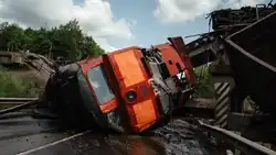 ![]() Wreckage of a diesel locomotive following the bombing of a bridge in Kursk Oblast | |