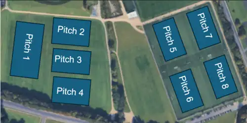 The image (left) is the pitch layout detailed in the official Gaynor Cup programme. Pitches 1–4 are grass pitches, whilst Pitches 5–8 are AstroTurf.