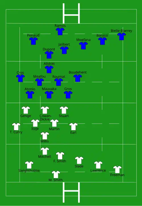 | Try: Lawrence 36' c Freeman 58' m Baxter 70' c Daly 79' c Con: M. Smith (1/2) 37' F. Smith (2/2) 71', 80' | Report | Try: Bielle-Biarrey (2) 30' c, 75' c Penaud 61' m Con: Ramos (2/3) 31', 76' Pen: Ramos (2/3) 50', 56' |