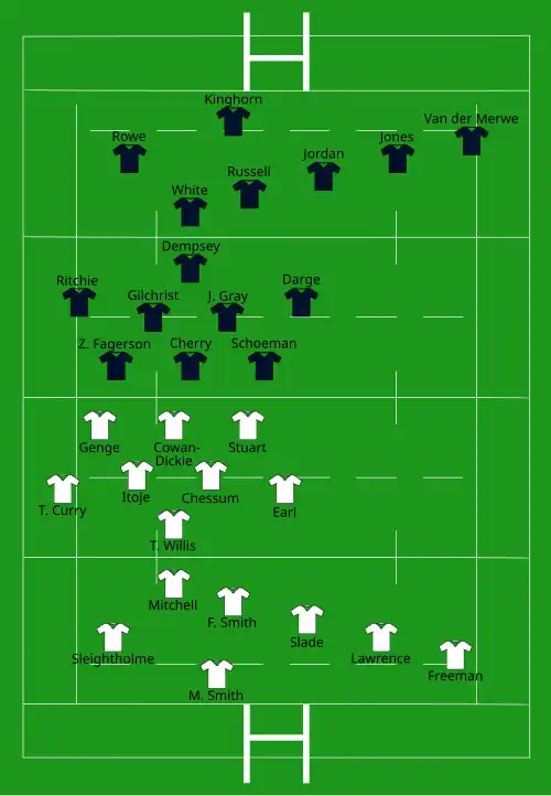 | Try: Capuozzo 20' c Con: Allan (1/1) 21' Pen: Allan (5/7) 7', 29', 34', 61', 74' | Report | Try: Wainwright 69' m Penalty try 79' Pen: B. Thomas (1/1) 17' |