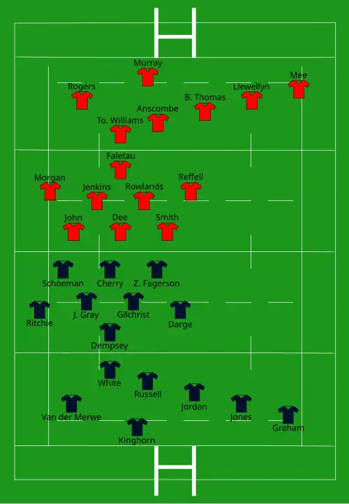 - Dafydd Jenkins and Liam Williams (Wales) were originally named to start the match, but withdrew prior to kick-off due to illness and injury, respectively. They were replaced by Freddie Thomas and Blair Murray, whose places on the bench were taken by Teddy Williams and Josh Hathaway.[28]