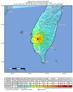 On 21 January 2025, at 00:17:26 TST (16:17 UTC on 20 January), a ML 6.4 (Mw 6.0) earthquake struck Dongshan District, Tainan City, Taiwan, near the border with Chiayi County. It was caused by reverse faulting and had a depth of 16 kilometres (9.9 miles).[1] It injured 50 people and damaged several thousand buildings across six counties and cities in the southwest of the island, mainly in Tainan. The earthquake was followed by a series of intense aftershocks, which caused additional damage in the most badly affected areas of the mainshock.