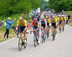 ![]() Visma–Lease a Bike leading the peloton on Roverello pass, stage 13 of Giro d'Italia 2025 | |
