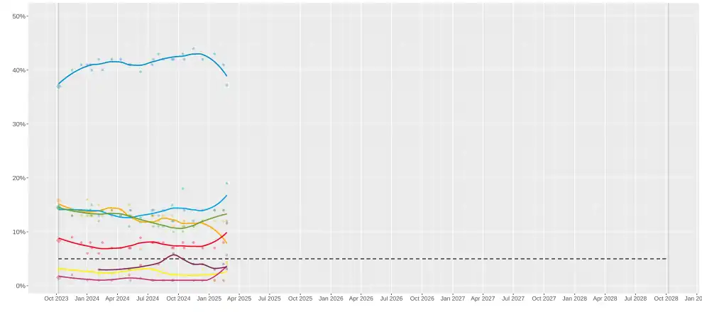 | Civey | 28 Mar – 11 Apr 2025 | 5,006 | 39 | 10 | 18 | 12 | 8 | 2 | 2 | 4 | 4 | 21 |