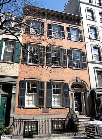 203 Prince Street is an historic townhouse on Prince Street between MacDougal and Sullivan Streets in the SoHo neighborhood of Lower Manhattan, New York City, United States. Built in 1834 with 2+1⁄2 stories on land that was once part of the estate of Aaron Burr, the house acquired an additional full story in 1888.[2] Primarily constructed in the late Federal style, the building also has elements of the Greek Revival style.[3][4]