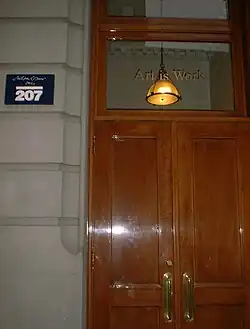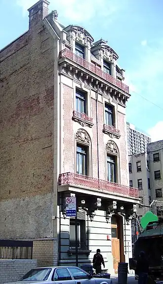 The house was designed in the Beaux Arts style by architect Robert T. Lyons. The building's decorative façade consists of red brick and limestone with two ornamental balconies and a mansard roof, which Christopher Gray of The New York Times described as being "showy for 32nd Street east of the Third Avenue El" and "worthy of any lot on Fifth Avenue".[1][18] The front entrance to the building originally contained a stoop;[4][19] the entrance was later modified to include a transom window with the motto "Art is Work" etched in the glass.[12][20]