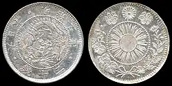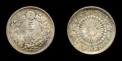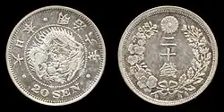 The 20 sen coin (二十銭銀貨) was a Japanese coin worth one fifth of a Japanese yen, as 100 sen equalled 1 yen.[1] These coins were all minted in silver during the Meiji era from 1870 to 1911.[2][3]