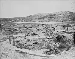 The Allies launched a coordinated series of offensives on 26–29 September. Second Army's attack (the Fifth Battle of Ypres) began on 28 September. The attack was a surprise, with no preliminary bombardment, but the assaulting troops were preceded by a dense creeping barrage. Despite the acknowledged weakness of 14th (L) Division, it had been given one of the toughest objectives: the 'Bluff'. This spoil heap from the construction of the canal had been fought over and undermined since early 1915: in the words of the Official History it 'bristled with machine guns and was expected to prove troublesome'.[b] 43rd Brigade attacked along the canal, with 12th Suffolks on the north bank, 20th Middlesex on the south, and 10th HLI in reserve. The Middlesex attacked with A (right) and B (left) Companies in front, formed up along 'Middlesex Road', C (right) and D (left) 400 yards (370 m) behind in support, each company in two waves formed of lines of 'worms' (sections in single file[72]). The attackers' helmets, brasses and bayonets were deliberately dulled, and the assembly was carried out silently, being completed an hour before Zero at 05.30. From Middlesex Road the ground rose gently but was deeply pitted with shellholes, overgrown with weeds and broken wire, making for bad going. The elongated 'Spoil Bank' along both canal banks was also covered with shellholes. When the barrage came down at Zero the leading waves set off. Although the men were of low medical category they were keen and confident and moved across the ground smartly, keeping close to the barrage. At first no information came back, and Battalion HQ of 20th Middlesex sent some of the snipers forward to find out the situation. About 07.20 parties of prisoners started to come back, with a few Middlesex wounded, with news that the first objective had been taken by 06.45. After 12th Suffolks had secured the Bluff, 20th Middlesex on the south side of the canal were able to pass it and continue up the rising ground to take their final objective, the ruins of 'White Chateau', by 08.20 without much opposition. This gave excellent observation east over the country beyond and south along the Messines Ridge, which was made untenable for the enemy. Only on the battalion's right, where the neighbouring battalion could not be found, was there any hold-up, so 20th Middlesex formed a defensive flank in that direction. 43rd Brigade having completed its task, other formations continued the battle on either flank. Battalion HQ moved up to White Chateau next day while the companies consolidated the position they had won. That night the battalion was relieved and went back to 'Smythe Camp' near Dickebusch, the troops being reported to be very cheerful'. The battalion had gone into action with 20 officers and 545 ORs and had lost 13 ORs killed, 2 officers and 58 ORs wounded, and 6 missing. It had captured about 210 prisoners, six field guns, two trench mortars and numerous light and heavy machine guns.[67][68][23][69][73][71][74][75]