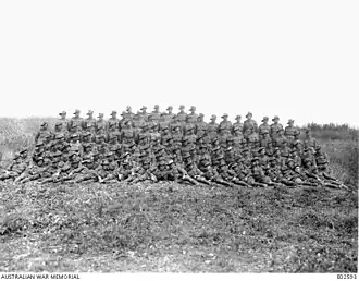 Following further training in Egypt, the 20th Battalion was sent to France, arriving there on 22 March 1916.[3] From there it proceeded to a position near Pozières, where it took up position in the trenches in April and, a month later, had the dubious honour of being the first Australian battalion to be raided by the Germans.[3] Later, in July and August the 20th took part in the Battle of Pozières, during which time it served in the line twice before moving to a quieter sector in Belgium for a period of rest. In October, however, the entire 2nd Division was moved to the south again and put back into the line in France once again and in November they launched an attack at Flers, in conditions that were so muddy that they were described by the official historian, Charles Bean, as "the worst ever encountered by the AIF".[3]