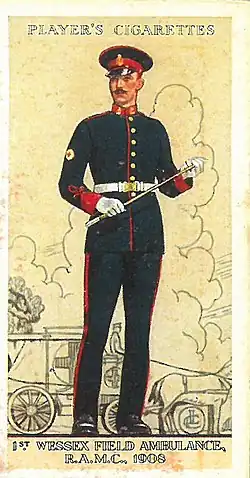 The No. 1 dress uniform of the hospital was as follows: Dark 'Royal' blue jacket, dark blue trousers and overalls, light blue piping, and 'dull cherry' red trouser stripes of 1 3/4 inch. The head dress was a dark blue cap, dull cherry band and welt.[26] The corps beret was dark blue all around with the RAMC cap badge on the front.[27] The RAMC was also granted a red lanyard, which was worn around either shoulder at the discretion of the commanding officer by soldiers.[28]