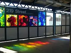 The 2006 artwork here is called Homage by Joseph D'Alesandro. It consists of stained glass panels on the platform windscreens that depict colors showing certain human emotions and qualities.[10]