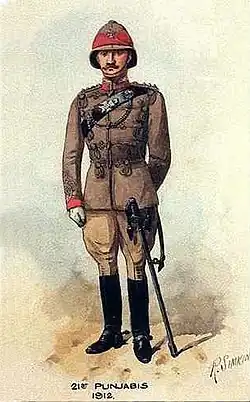 The 21st Punjabis were an infantry regiment of the British Indian Army. It was raised in 1857, as the 11th Regiment of Punjab Infantry. It was designated as the 21st Punjabis in 1903 and became 10th (Training) Battalion of 14th Punjab Regiment in 1922. In 1943, it was converted into the 14th Punjab Regimental Centre. In 1947, the 14th Punjab Regiment was allocated to the Pakistan Army. In 1956, the 1st, 14th, 15th and 16th Punjab Regimental Centres where amalgamated to form the Punjab Regimental Centre.[1]