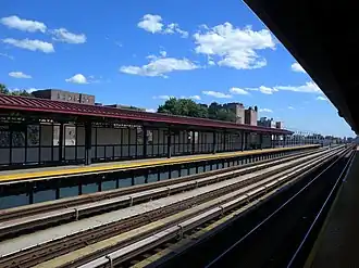 This elevated station has three tracks and two side platforms. The center express track is not normally used in revenue service.[9] Both platforms have beige windscreens and red canopies supported by green frames and columns in the center. They also have yellow ADA tactile strips on their edges. These were all installed during the 2006 rehabilitation. On either ends, both platforms have black waist-high fences made of steel, with white lampposts at regular intervals. The station signs are in the standard black name plates with white lettering.