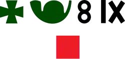 From left to right, top row: 11th Sherwood Foresters, 8th King's Own Yorkshire Light Infantry, 8th, 9th York and Lancaster Regiment. This brigades patches were based on regimental badges or battalion numbers. Bottom row: 70th Machine gun Company. Except for the MG company, which wore its patches on both sleeves, all patches were worn on the back, in addition the 8th York and Lancasters stencilled theirs on the helmet.[75] |