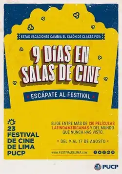 In July 2019, the Lima Film Festival officially announced its 23rd edition, under the motto "Escape to the Festival" (Spanish: Escápate al Festival) The festival took place from Friday, August 9th to Saturday, August 17th, 2019. Organized by the Pontifical Catholic University of Peru, through its Cultural Center, and presented in collaboration with the BBVA Foundation, the Ministry of Culture of Peru, the Gran Teatro Nacional del Perú, and El Comercio,[1] tickets for the event went on sale from August 2nd, 2019, at the festival's official venues.[2]