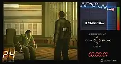 24's minigames serve as interludes from the main mission, and are primarily interrogation sequences or computer puzzles. They are presented both as single puzzles in third-person missions, and as timed stand-alone missions.[1] The computer puzzles include maze puzzles, where a player must select a coloured path from a starting box to an ending box and sometimes a second and third box, are used to represent bypassing locks and other computer functions. Letter sequence puzzles, where a player swaps adjacent pairs of a series of random letters until they are in the correct sequence, are used to represent code-breaking such as for encrypted files or a locked door. Colour/symbol matching puzzles, where a cursor randomly moves across a field of coloured squares and the player must press the controller button that corresponds to that coloured square, are used to represent unscrambling files from hard drives and other similar functions. A number of other puzzles are used only once, including puzzles to simulate transferring files over a damaged network, infrared scanning of buildings, radar-like scanning of areas, and creating a network link across the entire planet.[5]