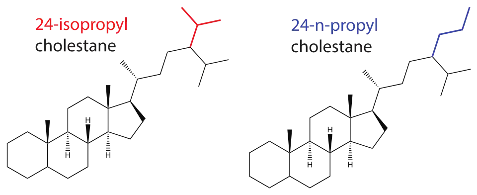 24-isopropyl cholestane (figure 1, left) is a C30 sterane with chemical formula C30H54 and molecular mass 414.76 g/mol. The molecule has a cholestane skeleton with an isopropyl moiety at C24 and is the geologically stable form of 24-isopropyl cholesterol.[3] A related and important molecule is 24-n-propyl cholestane (figure 1, right), also with the cholestane skeleton, but with an n-propyl moiety at C24.