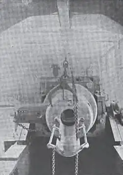 Ammunition on the Eisenbahnlafette and E. u. B. mounts was moved by means of an overhead rail from which a pair of shell tongs lifted up individual shells to be placed in the loading tray fixed to the breech. An extensible rail could raised and braced in place to allow the tongs to reach shells placed on the ground on in an ammunition car behind the mount.[3] The gun had to be loaded at zero elevation and thus needed to be re-aimed between each shot. The "Theodor Karl" used two different shells, one armor-piercing and the other high-explosive, that both weighed 151 kg (333 lb). It used the German naval system of ammunition, where the base charge was held in a metallic cartridge case and supplemented by another charge in a silk bag that was rammed first.[4]