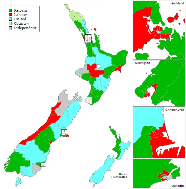 - ^ The Reform and United parties could not agree on an official coalition candidate for the Timaru electorate, so neither Armstrong (Reform) nor Herbert Hall (United) were official candidates, and many sources show them as Independents