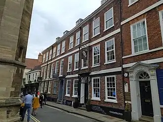 The terrace lies on High Petergate, one of the main streets in York. Nos. 27 and 29 were designed by John and George Bowes and completed by 1701, while No. 25 was added in 1707. All three are three storeys tall, with an attic, and built of orange brick, on a stone plinth. Each is of a different width: No. 25 is five bays wide, No. 27 two bays, and No. 29 four bays. The centre bay of No. 25 is slightly forward of the rest of the facade.[1][2]