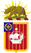 The shield is red for Artillery. The six pallets couped produce a diminished bordure effect on the shield and represent the six batteries comprising the Regiment at the time of its organization. The ship is a representation of the ship of Don Juan Rodrigues Cabrillo, a Portuguese, who discovered San Diego Harbor. The charges on the canton, the fleur-de-lis encircled by a garland of laurel, are taken from the coat of arms of the 250th Coast Artillery, as Batter B of the 251st Coast Artillery, California National Guard, is a descendant of Batter F of the 250th Coast Artillery, California National Guard which served during World War I as B Battery of the 65th Coast Artillery (US).