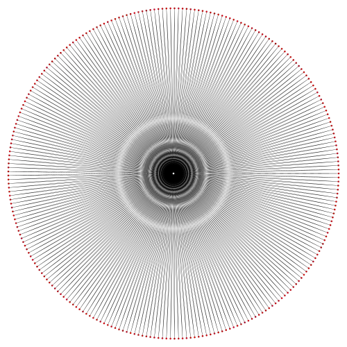 Below is a view of {257/128}, with 257 nearly radial edges, with its star vertex internal angles 180°/257 (~0.7°).