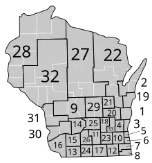 | 24 | Green County | Ashland, Barron, Bayfield, Burnett, Douglas, Pierce, Polk, St. Croix counties |