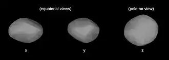 - ^ Parker et al. (2024) give Justitia's ellipsoid dimensions in terms of semi-axes, or radii along the x, y, and z axes.[6]: 6 The dimensions listed here are twice the semi-axis values.