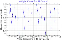 The variability of the brightness of 27 Cancri was announced by Joel Stebbins and Charles Morse Huffer in 1928, based on observations made at Washburn Observatory.[11] It was given its variable star designation, BP Cancri, in 1977.[12]