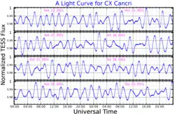 In 1973, John R Percy announced that 28 Cancri might be a variable star.[12] Stephen John Horan et al. confirmed that the star's brightness varies, in 1974.[13] In 1979, it was given its variable star designation.[14] It is a Delta Scuti variable star with a period of 0.0960 days and an amplitude of 0.020 in magnitude.[15] With 2.4 times the mass of the Sun it is spinning with a high projected rotational velocity of 133 km/s. 28 Cancri is radiating roughly 44 times the Sun's luminosity from its photosphere at an effective temperature of around 7,516 K.