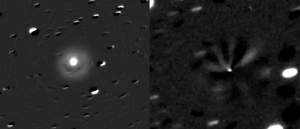 The comet is unusual in that while normally hovering at around 16th magnitude, it suddenly undergoes an outburst. This causes the comet to brighten by 1 to 5 magnitudes.[10] This happens with a frequency of 7.3 outbursts per year,[10] fading within a week or two. The magnitude of the comet has been known to vary from 18th magnitude to 10th magnitude, a more than thousand-fold increase in brightness, during its brightest outbursts. On 14 January 2021, an outburst was observed with brightness from 16.6 to 15.0 magnitude, and consistent with the 7.3 outbursts per year noted earlier.[11] Outbursts are very sudden, rising to maximum in about 2 hours, which is indicative of their cryovolcanic origin; and with the times of outburst modulated by an underlying 57-day periodicity possibly suggesting that its large nucleus is an extremely slow rotator.[12]