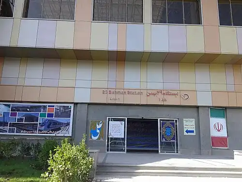 29 Bahman Metro Station is a station on Tabriz Metro Line 1. The station opened on 27 August 2015. It is located on 29 Bahman Boulevard at Tabriz Cable Bridge. It is between Khayyam Metro Station and Ostad Shahriar Metro Station.