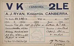 Albert John "Jack" Ryan was an AIF veteran and former signaller during the first World War. In the late 1920s Ryan relocated to Canberra, setting up an electrical repair shop in the Canberra suburb of Kingston.[2] He was soon operating an experimental wireless telegraphy station (Callsign: VK2LE) communicating with other such stations throughout Australia and the Pacific. In early 1930 he upgraded his equipment to wireless telephony and began broadcasting experimental programs to the Nation's Capital and immediate environs. The programmes were well received by Canberra listeners and after approaching the Postmaster-General's Department, Jack was granted Canberra's first (and for many years, only) commercial broadcasting licence.