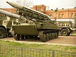 From 1953, the Luna system was developed in the NII-1, under the supervision of N. P. Mazurov. Luna followed the earlier designs 2K1 Mars and 2K4 Filin. While the NII-1 was responsible for the rocket, the launch and transporter-loader vehicles were designed by the TsNII-58. The initial system name was S-125A "Pion".[2] In 1957, the prototypes of the launch vehicle (SPU S-123A on a Ob'yekt 160 chassis), the transloader (TZM S-124A on a Ob'yekt 161 chassis) and the 3R5 rocket were ready for evaluations. These were carried out in 1958 in Kapustin Yar, and in 1959 in the Transbaikal Military District.[3]