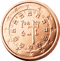 | The royal seal of 1134 (stylised "Portugal") surrounded by the country's castles and five escutcheons with silver bezants set in relation to the surrounding European stars, and is intended to symbolise dialogue, exchange of values and dynamics in the building of Europe. Between the castles are the numbers of the year towards the bottom and the letters of the name Portugal between the upper icons. The stars are inset on a ridge. | 1999–onward |