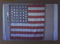 The 2nd California Cavalry has a number of company guidons preserved in the state capitol.[1] The Regimental colors were lost; the only flags that survived were one national flag and three company flags.[2] Most of these flag were made by locals in towns and nearby areas for "their" companies.[1][3] In 1862 Quartermaster R. L. Ogden Ordered four guidons from D. Norcross for Companies B, D, G, and J.[4] A few months later Lieutenant Livergood of Company I was presented with a national flag made by the women of Visalia.[5]
