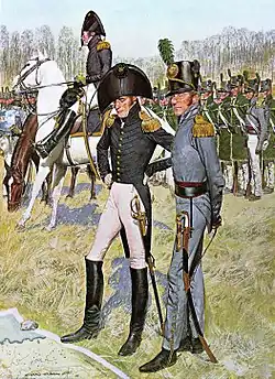 ![]() Riflemen officer in gray (foreground) and troops in green smocks (background) | |