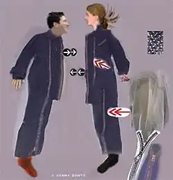 The 2suit is a flight suit with a large front flap that can be opened and attached to another 2suit via Velcro strips.[1]