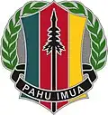 The Distinctive Unit Insignia is a silver pin with a six sided rounded pointed shield divided into three vertical sections teal, red and gold with a single Hawaiian spear in the center. Above it is a green laurel wreath and below is a black scroll with the motto "Pahu Imua" (Push Forward). The insignia was approved on 20 October 2010.[4]