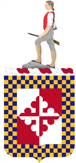 The 306th's distinctive unit insignia was approved on 15 August 1924 and its coat of arms on 6 September 1928. The distinctive unit insignia included a 1 1/8 in (2.86 cm) silver colored metal and enamel device, which consisted of a red and gray shield with a modified Lord Baltimore Cross bordered by yellow and blue squares. The Lord Baltimore cross symbolized the regiment's location in the Maryland–Washington, D.C. area during the interwar period, yellow represented cavalry, and blue represented Federal service. The regimental coat of arms was of a similar design to the distinctive unit insignia but included the Organized Reserve's Minuteman crest above the shield and depicted a red and white Lord Baltimore Cross instead of the distinctive unit insignia's red and gray.[7]