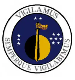 - ^ Approved 12 March 1962. Description: On an Air Force blue disc within a wide white border, fimbriated black, a disc per pale black and Air Force golden yellow, its center at nombril point, surmounted by a sword palewise, pointing downward, the blade per pale Air Force golden yellow and black, hilt and pommel black, grasped by a mailed hand fesswise in chief, Air Force golden yellow, outlines and shading golden brown; all between in dexter three stars, all white The motto inscribed on the border in black.