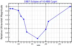 The two stars form an eclipsing binary system (variable star designation: V1488 Cyg) similar to Algol. The orbital plane of the two stars is nearly aligned with the line of sight from the Earth, so that the supergiant star eclipses the secondary component once per orbit. During an eclipse, emission lines can be seen in the spectrum of this system. These originate in the stellar wind escaping from the supergiant star. In a volume around the B star, this wind becomes ionized, resulting in a circumstellar H II region.[17] The supergiant star is losing mass at the rate of 1.3×10−8 times the mass of the Sun per year, or the equivalent of the Sun's mass every 77 million years.[6]
