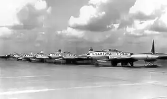 The group was reconstituted, designated the 342d Fighter-Day Group, and activated in July 1956 as part of the 342d Fighter-Day Wing when the Air Force re-opened Myrtle Beach Air Force Base, South Carolina. The group began training with Lockheed T-33 T-Bird advanced jet trainers and reconnaissance versions of the single seat Lockheed F-80 Shooting Stars in preparation for equipping with the North American F-100 Super Sabre. However, before the group could reach operational status, it was inactivated and its personnel and equipment were transferred to the 354th Fighter-Day Group.[4][6]