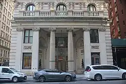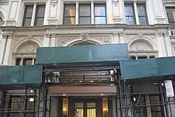 During the replacement building's construction, falling masonry injured two workers in 1896,[103] and an elevator collapsed and injured six workers in 1897.[104][105] As part of the project, New York Life wanted to take over Catherine Lane and build vaults underneath it; this was difficult because the alley was city-owned property.[106] In addition, New York Life wanted to build an entrance portico on Broadway, but New York City's commissioner of public works had initially forbidden the portico's construction.[28] New York Life was eventually allowed to build a projecting portico with six columns and an ornate balustrade.[22] The Merchants' Association moved into the ground floor of the structure in July 1897.[107] McKim, Mead & White completed the replacement building in April 1898.[102][h]