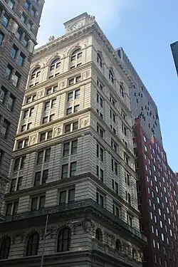 The company decided in August 1893 to hire Hatch, who was less well-known than the other competitors, to design the annex.[98] Plans for the annex were filed in April 1894.[99][100] The project would also involve masonry contractor L. W. Armstrong, marble contractor Norcross Company, iron contractor Post and McCord, and carpenter E. Hilbrand.[100] Construction commenced in May 1894, but Hatch died three months later, before construction was completed.[27][98] After Hatch's death, McKim, Mead & White took over the project,[90][2] designing an annex that extended about 200 ft (61 m) west from Elm Street.[101] The annex ultimately cost $1.5 million to construct.[16] The Merchant's Club moved into the top two stories of the annex, which opened in February 1896.[68] The New-York Tribune wrote that the structure would be "one of the most striking improvements in Broadway" south of Canal Street.[101] The New York Times described the New York Life Building as being in a "rivalry" with the Central National Bank Building to the south, at Pearl Street and Broadway.[29]