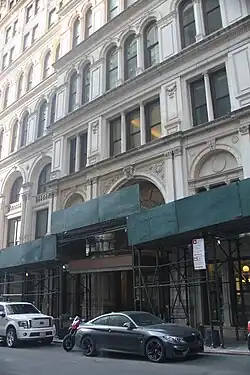 The western end of 108 Leonard comprises a pavilion measuring three bays wide on Broadway, Catherine Lane, and Leonard Street.[18][27] All three elevations of this pavilion are clad with rusticated blocks of marble.[18] The main entrance on Broadway is designed to resemble a portico, with double-height pilasters and freestanding columns topped by an entablature with a balustrade.[23] The portico originally contained six freestanding columns that projected from the facade,[22][28] but these were removed in 1912 at the request of the government of New York City.[22] Each of the polished-granite pillars weighed over 16 short tons (14 long tons; 15 t) and measured 23 ft (7.0 m) long by 3 ft (0.91 m) across.[29] The capitals of each column are decorated with rosettes and swags in a modified Ionic order.[22] Recessed within this main entrance is a double-height curved vestibule, which includes two archways with acanthus and scallop decorations.[23][30] The archways themselves contain cast-bronze window frames above the doors, while the vestibule's ceiling contains a coffered ceiling with an eagle motif at the center.[30] On either side of the entrance are panels with acanthus motifs.[22]