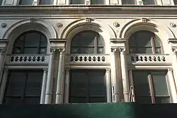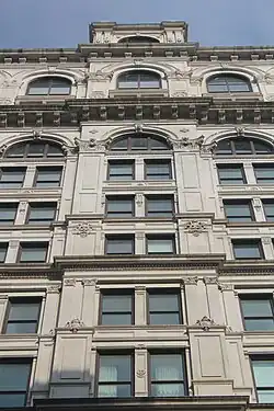The remainder of the Leonard Street elevation is divided by band courses at the same levels as on the Lafayette Street pavilion.[23] There are nine bays to the west of the entrance pavilion, excluding the Broadway pavilion. In the western bays, the 1st and 2nd stories contain square-headed windows with composite columns between them. There are seven such bays to the east of the entrance pavilion, excluding the Lafayette Street pavilion.[32] These bays contain double-height archways on the 1st and 2nd stories, since these originally overlooked the general office.[31] The windows on the other stories are separated by flat pilasters; the windows on the 3rd, 4th, 10th, and 12th stories are round-arched, while the other windows are square-headed.[32] Above the 12th story is a balustrade with a parapet.[31]